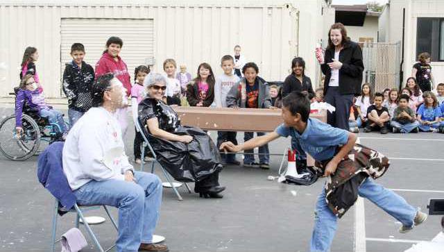 Most students with perfect attendance get a pat on the back or a certificate, but at Crowell Elementary students who have no absences for an entire month get a much sweeter reward. Students who had perfect attendance for the month of March got to throw a whipped cream pie at Principal Linda Alaniz and Assistant Principal Robert Lanz in a “Just Say Go” incentive event on Thursday. Ten students out of the over 100 students from Crowell who had perfect attendance got the privilege of covering the faces of their principal and assistant principal in whipped cream.