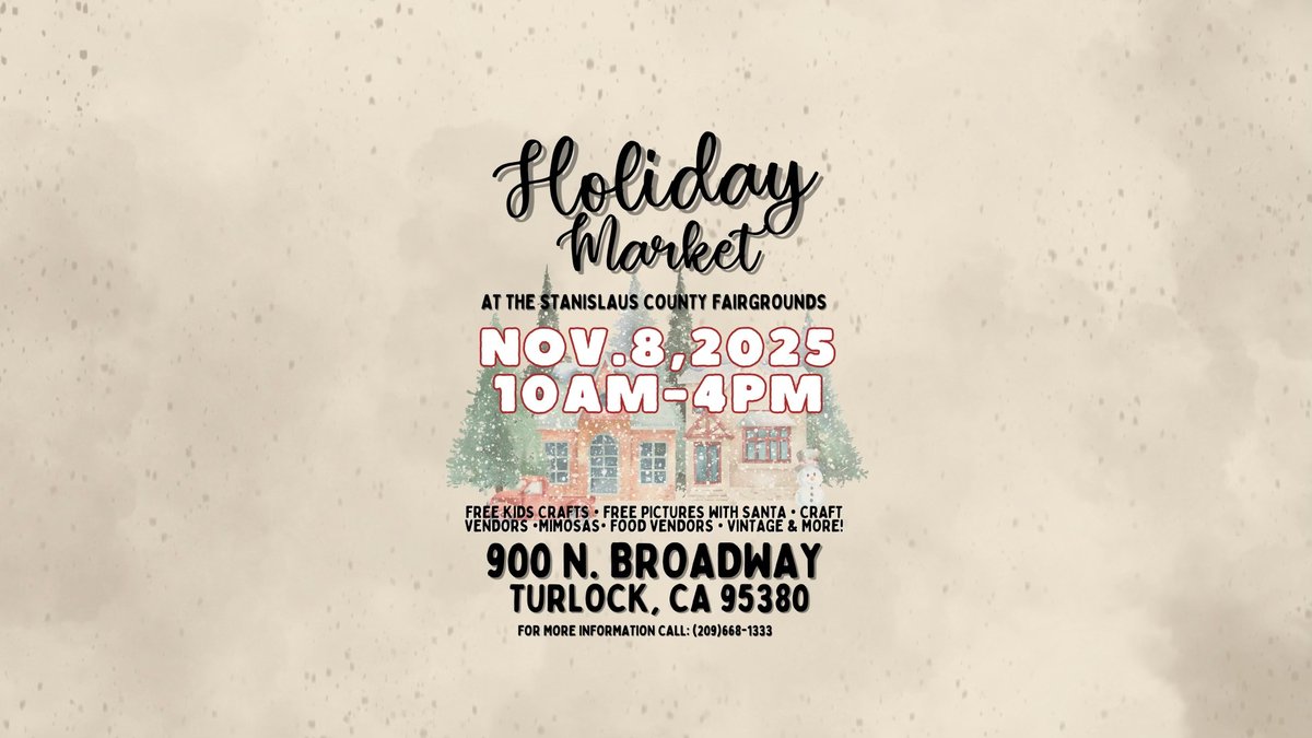 Holiday Market: The 2nd annual Holiday Market at the Stanislaus County Fairgrounds will be held from 10 a.m. to 4 p.m. Saturday. Entry is free for this craft fair that will feature a variety of vendors, kids crafts, complimentary mimosas and a photo op with Santa. The fairgrounds is located at 900 N. Broadway, Turlock.