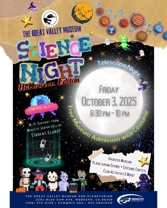Science Night: The Great Valley Museum will host its monthly Science Night at the Museum from 6:30 p.m. to 10 p.m. Friday. This month’s event will be Halloween themed with a haunted museum, a costume contest and planetarium shows. There will be free museum admission with costume. The museum is located at 2201 Blue Gum Ave., Modesto.