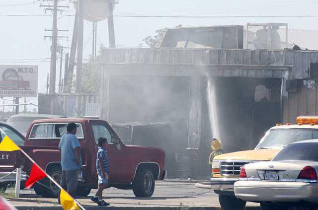 The 3:50 p.m. blaze ignited as a mechanic at Auto Servicio Quiroz, at the corner of Santa Fe Avenue and Third Street, caused a spark which ignited gasoline that was leaking from a vehicle he was working on. The vehicle caught on fire and flames spread into the shop itself. The fire burned into the common attic with adjoining Hughson Tire Sales.