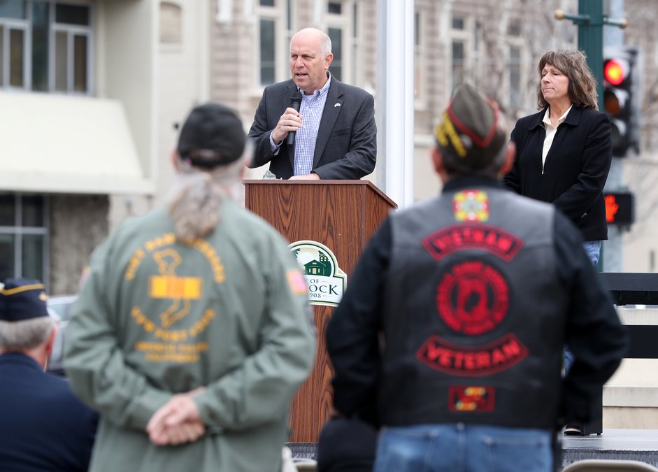 A gloomy, grey sky added emotion to memorializing and honoring those who served and gave all during the Vietnam War several decades ago. The City of Turlock, along with dignitaries and citizens, gathered in front of the Public Safety Facility for a special ceremony honoring Vietnam Veterans Day Friday morning. After the speakers, 21-gun salute and the playing of “Taps,” everyone was invited to write the name of a loved one who served in the war on a yellow ribbon and tie it around the flag poles which represent each branch of the military. Army veteran Lee Beldon was pleased with the ceremony but said, "The new generation has forgotten and don't understand the number of men who gave their lives, not exactly willingly, they were taken on behalf of our country." When asked if it would uplift veterans' hearts if more youth were present and involved with ceremonies like these he said, "I'm very concerned about that and that's why I'm glad this took place and that's why I'm here."