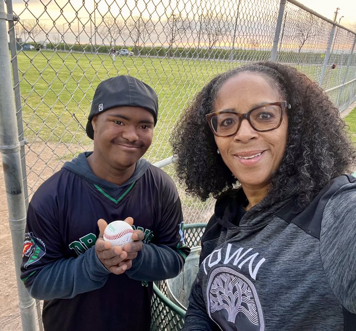 Edan Thibodeaux and his mom Jadon pose for a photo at Pedretti Park after Edan was invited to receive the first pitch of the baseball game between Turlock Christian High School and Delta Charter of Tracy. Edan was also able to hit the second throw from TC’s Will Kelly and ran to first base where Delta Charter players awaited to cheer him on. Edan was gifted the game ball signed by the umpires and, according to his mom, he carried it around with pride and joy. Jadon said it was “a delight to see for fans on both sides and truly an impactful way to Honor Down Syndrome Day” which was March 21.